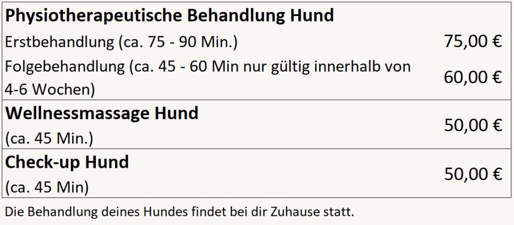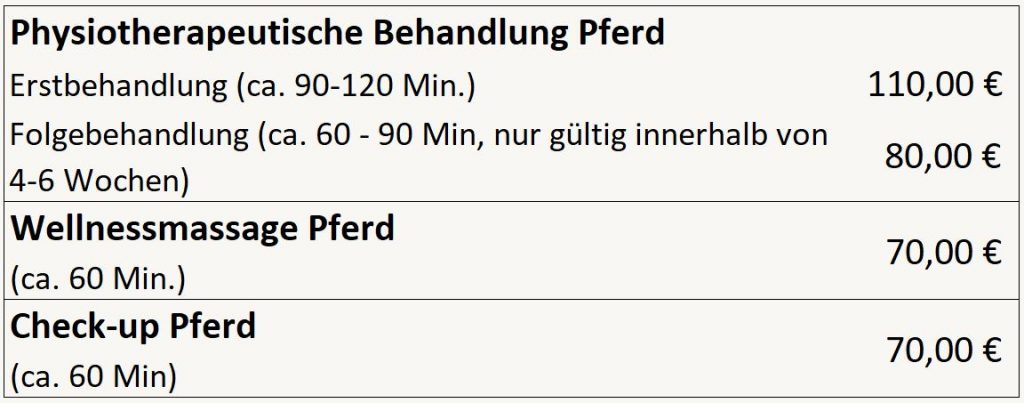 Die Bezahlung erfolgt vor Ort in Bar oder per Paypal. Die genannten Beträge sind jeweils direkt nach der Behandlung fällig.